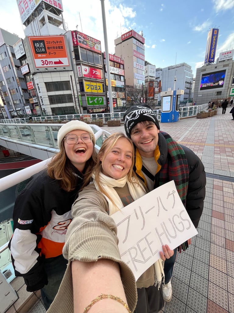 Most of our ministry in Japan revolved around street ministry, where we would talk to strangers we met in the streets. One of my favorite things we would do during ministry time is when we’d hold up big signs that said “Free hugs” in big letters outside of train stations or inside malls. You’d think that in a culture where everyone was reserved and polite that giving out hugs to strangers would be ineffective, but it was actually the other way around!